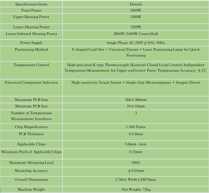 1. 3-Zone Independent Temp Control: Upper/lower zones with hot air heating, IR preheating zone with infrared heating (±2℃ precision). 8 temperature control segments, supporting simultaneous heating of component tops and PCB bottoms. Large-area IR preheating prevents PCB deformation, with independent heating plate control and flexible upper/lower heater combination.
