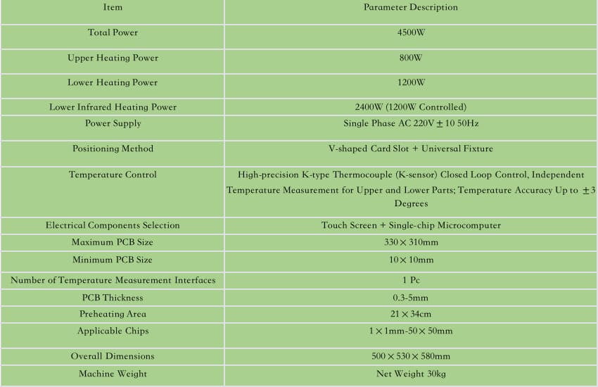 1. Simultaneous local hot air heating for BGA chips/PCB boards + bottom infrared preheating, avoiding PCB deformation; flexible combination of upper/lower temperature zones.