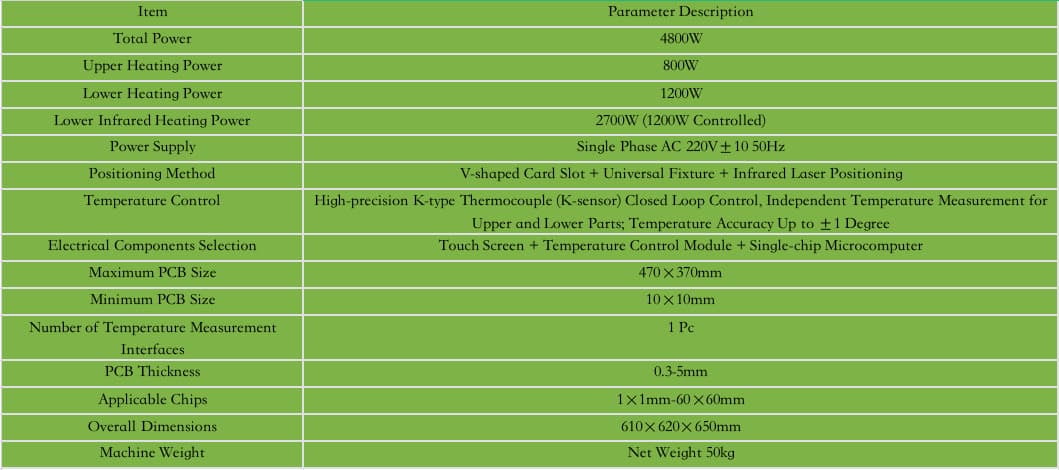 3. Employs three independent heating zones: upper and lower zones use hot air heating, and the bottom zone uses infrared heating. Temperature is precisely controlled within ±3 degrees Celsius. The upper zone can be freely moved as needed, the second zone is vertically adjustable, and the upper and lower heaters can be set with multiple temperature control segments simultaneously. The IR preheating zone’s output power can be adjusted according to actual requirements.