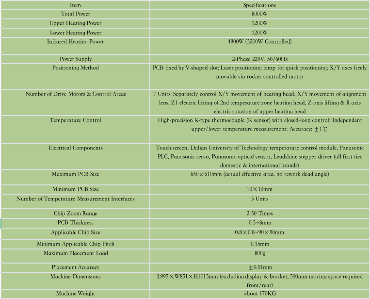 One-click start, capable of removing 6 faulty chips at a time; equipped with an infrared preheating zone to improve process stability.