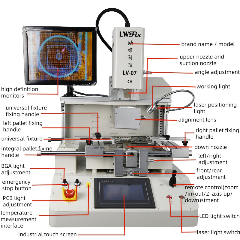 A BGA rework station is a machine that can be used to refinish or repair printed circuit boards (PCBs) with ball grid array (BGA) packaging and surface-mounted devices (SMDs). These rework stations allow the technicians to remove defected parts, reinstall incorrectly placed parts or replace any missing part in the PCBs. Rework stations can also be used to work on PCBs with column grid array packaging, chip scale packages, quad flat packages, land grid arrays or other SMDs. Thus, BGA rework stations are frequently named SMD rework stations or surface-mounted technology (SMT) rework stations.